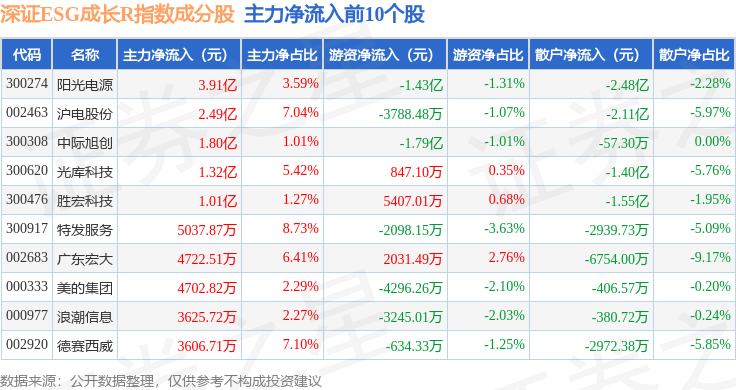 资金流向方面,深证ESG成长R(470060)指数成份股当日主力资金净流出合计9.99亿元,游资资金净流入合计2.91亿元,散户资金净流入合计7.08亿元。成份股资金流向详情见下表: