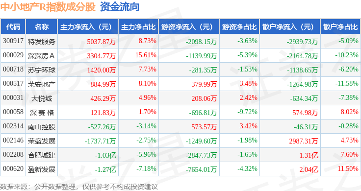 资金流向方面,中小地产R(471002)指数成份股当日主力资金净流出合计1.41亿元,游资资金净流出合计1.48亿元,散户资金净流入合计2.89亿元。成份股资金流向详情见下表:
