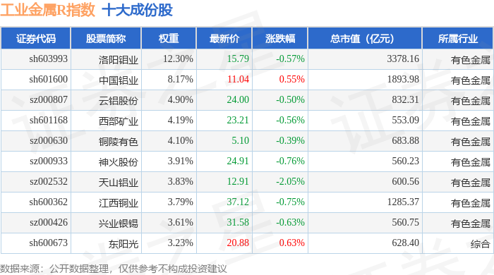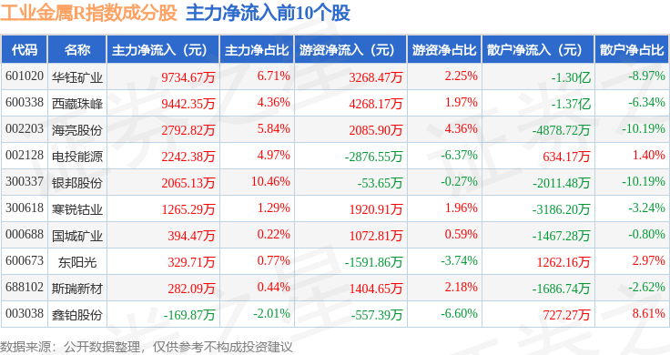 资金流向方面,工业金属R(480043)指数成份股当日主力资金净流出合计19.47亿元,游资资金净流入合计6.61亿元,散户资金净流入合计12.86亿元。成份股资金流向详情见下表: