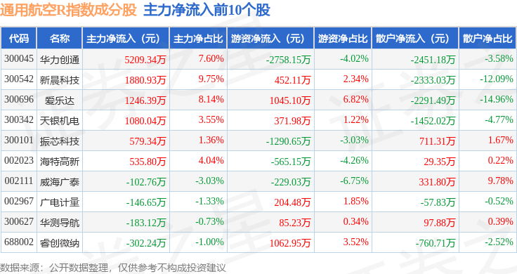 资金流向方面,通用航空R(480076)指数成份股当日主力资金净流出合计10.65亿元,游资资金净流入合计3.81亿元,散户资金净流入合计6.83亿元。成份股资金流向详情见下表: