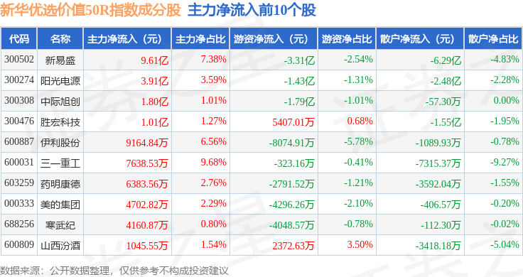 资金流向方面,新华优选价值50R(489004)指数成份股当日主力资金净流出合计41.27亿元,游资资金净流入合计4.59亿元,散户资金净流入合计36.67亿元。成份股资金流向详情见下表:
