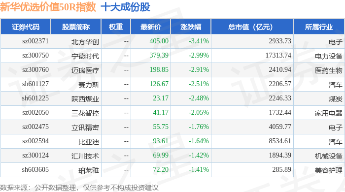 新华优选价值50R(489004)指数十大成份股详情如下: