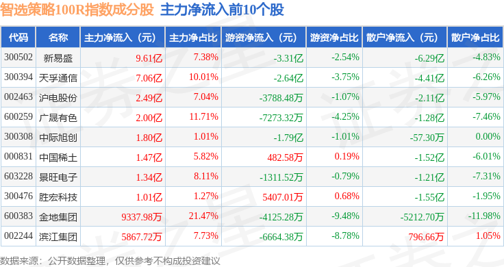 资金流向方面,智选策略100R(489015)指数成份股当日主力资金净流出合计29.91亿元,游资资金净流入合计12.46亿元,散户资金净流入合计17.45亿元。成份股资金流向详情见下表: