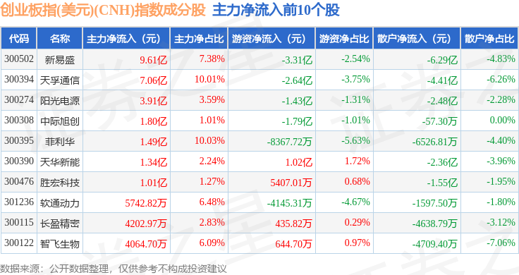 资金流向方面,创业板指(美元)(CNH)(970007)指数成份股当日主力资金净流出合计39.25亿元,游资资金净流出合计6628.45万元,散户资金净流入合计39.91亿元。成份股资金流向详情见下表: