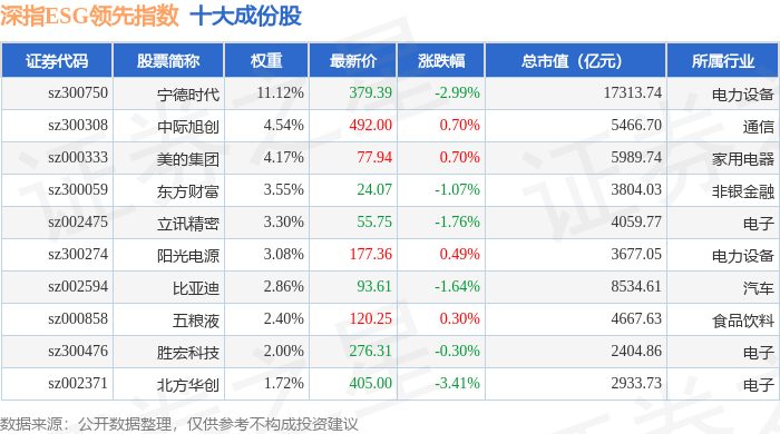 深指ESG领先(970029)指数十大成份股详情如下: