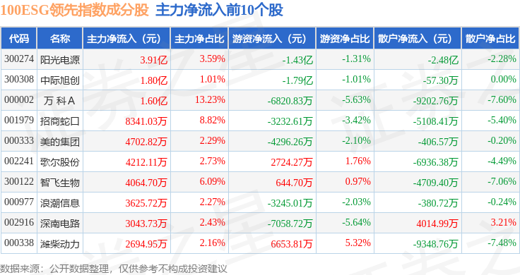 资金流向方面,100ESG领先(970030)指数成份股当日主力资金净流出合计37.31亿元,游资资金净流出合计1.09亿元,散户资金净流入合计38.4亿元。成份股资金流向详情见下表: