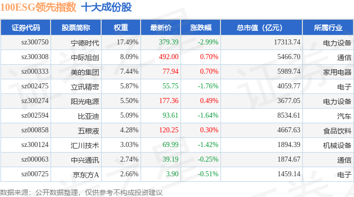 证券之星消息,11月20日,100ESG领先(970030)指数报收于6425.16点,跌0.96%,成交1097.12亿元,换手率0.97%。当日该指数成份股中,上涨的有13家,北新建材以5.69%的涨幅领涨,下跌的有36家,晶澳科技以4.55%的跌幅领跌。
