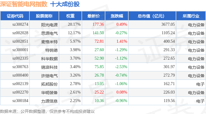 证券之星消息,11月20日,深证智能电网(970054)指数报收于3847.88点,跌0.59%,成交280.76亿元,换手率2.96%。当日该指数成份股中,上涨的有9家,高澜股份以2.65%的涨幅领涨,下跌的有41家,朗新集团以4.43%的跌幅领跌。