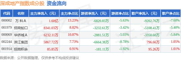 资金流向方面,深成地产(971001)指数成份股当日主力资金净流入合计3.66亿元,游资资金净流出合计1.98亿元,散户资金净流出合计1.68亿元。成份股资金流向详情见下表: