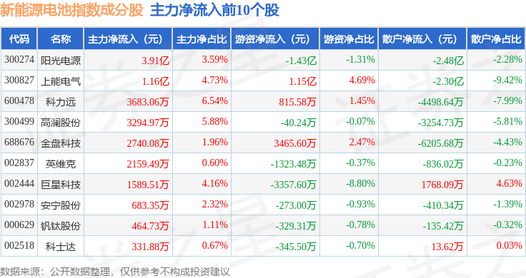 资金流向方面,新能源电池(980027)指数成份股当日主力资金净流出合计22.08亿元,游资资金净流出合计1.36亿元,散户资金净流入合计23.44亿元。成份股资金流向详情见下表: