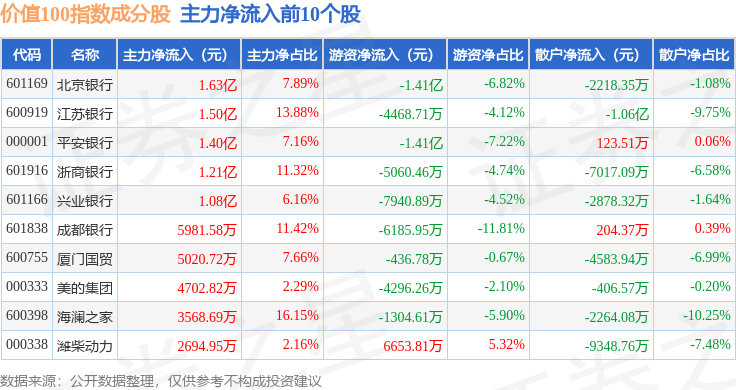 资金流向方面,价值100(980081)指数成份股当日主力资金净流出合计8.57亿元,游资资金净流入合计1.58亿元,散户资金净流入合计6.97亿元。成份股资金流向详情见下表: