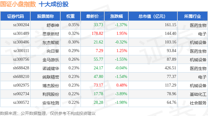 证券之星消息,11月20日,国证小盘(980202)指数报收于1751.65点,跌0.78%,成交1813.38亿元,换手率3.91%。当日该指数成份股中,上涨的有361家,倍杰特以20.02%的涨幅领涨,下跌的有1108家,国联水产以11.52%的跌幅领跌。