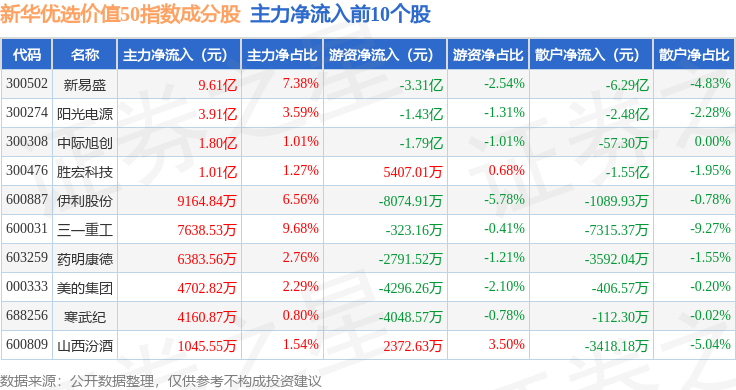 资金流向方面,新华优选价值50(989004)指数成份股当日主力资金净流出合计41.27亿元,游资资金净流入合计4.59亿元,散户资金净流入合计36.67亿元。成份股资金流向详情见下表: