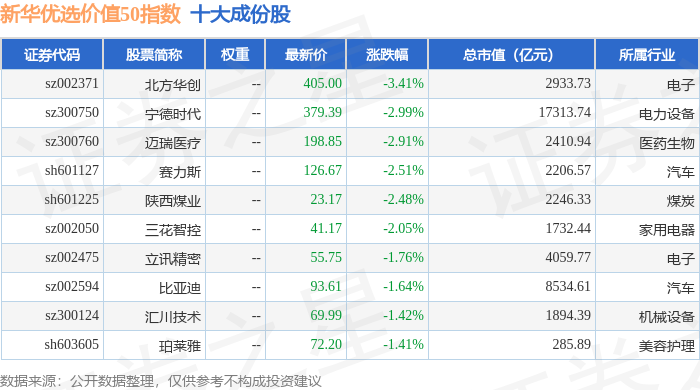 证券之星消息,11月20日,新华优选价值50(989004)指数报收于2127.14点,跌0.75%,成交1419.0亿元,换手率0.75%。当日该指数成份股中,上涨的有14家,恒立液压以2.56%的涨幅领涨,下跌的有36家,北方华创以3.41%的跌幅领跌。