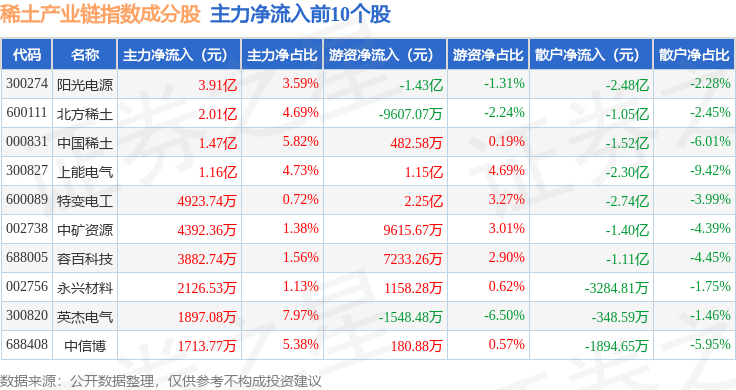 资金流向方面,稀土产业链(989013)指数成份股当日主力资金净流出合计21.73亿元,游资资金净流入合计6.75亿元,散户资金净流入合计14.98亿元。成份股资金流向详情见下表: