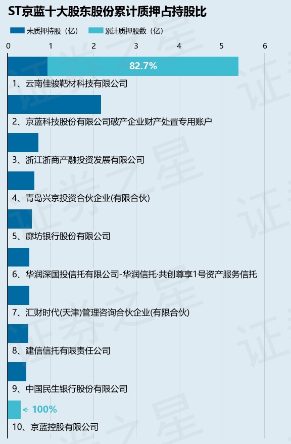 截止本公告日,股东云南佳骏靶材科技有限公司已累计质押股份4.47亿股,占其持股总数的82.7%,股东京蓝控股有限公司已累计质押股份3000.0万股,占其持股总数的100.0%。本次质押后ST京蓝十大股东的累计质押股份占持股比例(占持股比例的计算以公司最新一期财务报表公布的十大股东的持股总数为基准)见下图: