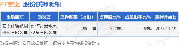 证券之星消息,ST京蓝(000711)11月20日公开信息显示,股东云南佳骏靶材科技有限公司向红河红发水务投资有限公司合计质押2000.0万股,占总股本0.69%。质押详情见下表: