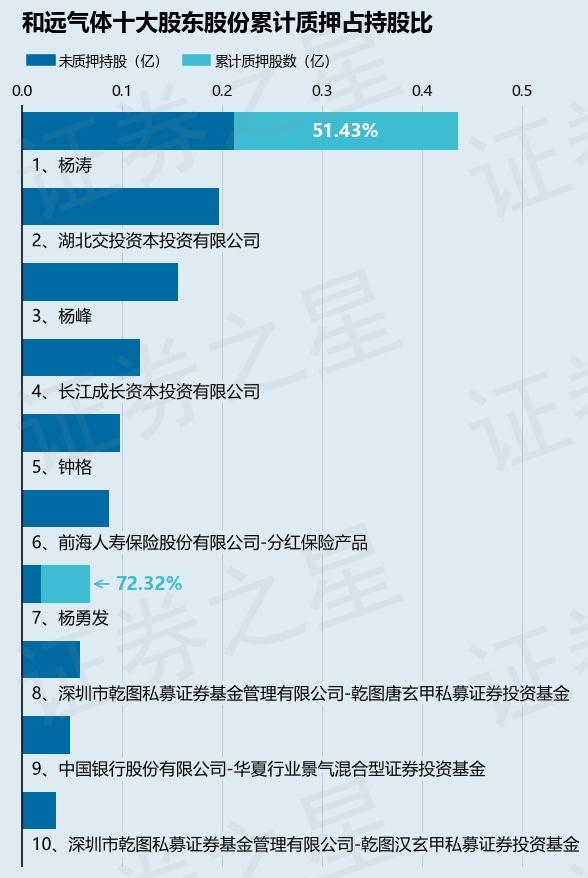 截止本公告日,股东杨涛已累计质押股份2242.98万股,占其持股总数的51.43%,股东杨勇发已累计质押股份495.0万股,占其持股总数的72.32%。本次质押后和远气体十大股东的累计质押股份占持股比例(占持股比例的计算以公司最新一期财务报表公布的十大股东的持股总数为基准)见下图: