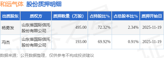 证券之星消息,和远气体(002971)11月20日公开信息显示,股东杨勇发、冯杰向山东省国际信托股份有限公司合计质押688.0万股,占总股本3.25%。质押详情见下表:
