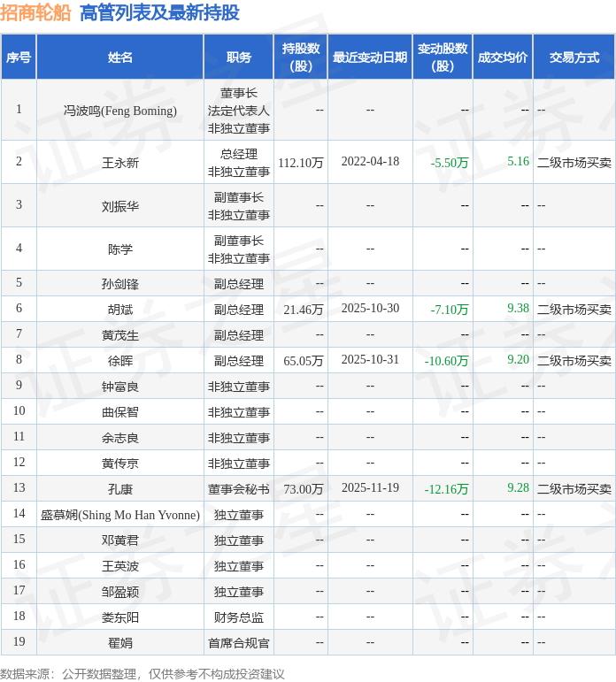招商轮船的高管列表及最新持股情况如下: