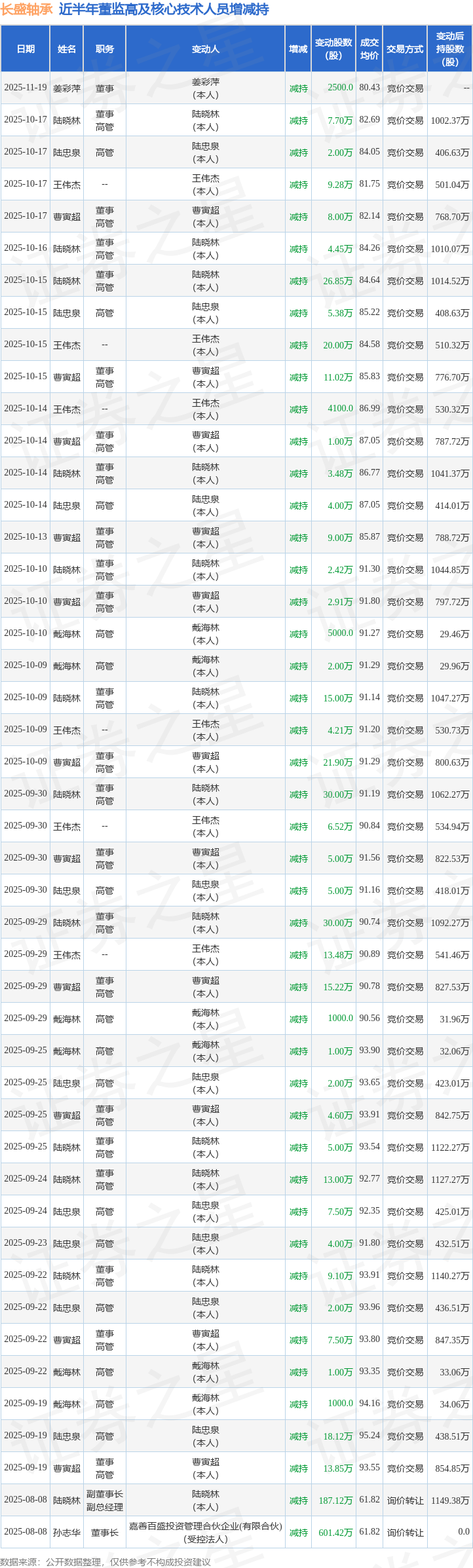 长盛轴承近半年内的董监高及核心技术人员增减持详情如下: