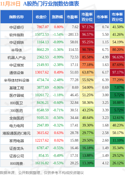 热门行业指数方面,中证银行的市盈率百分位较高,为97.17%。而800消费的市盈率百分位较低,为13.39%。
