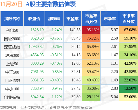 A股主要宽基指数方面,科创50的市盈率百分位较高,为95.13%。而创业板指的市盈率百分位较低,为29.11%。