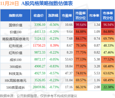 风格策略指数方面,国信价值的市盈率百分位较高,为99.64%。而500质量成长的市盈率百分位较低,为66.31%。