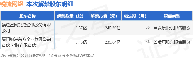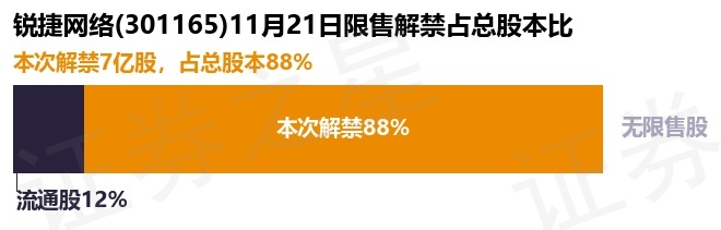 证券之星消息,根据市场公开信息整理,锐捷网络(301165)于11月21日将有7.0亿股限售股份解禁,为公司首发原股东限售股份,占公司总股本88.0%。(本次数据根据历史公告整理得出,实际情况以上市公司最新公告为准)本次解禁后,公司已无限售股份。具体如下图所示: