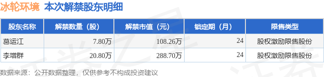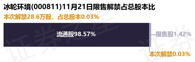 证券之星消息,根据市场公开信息整理,冰轮环境(000811)于11月21日将有28.6万股限售股份解禁,为公司股权激励限售股份,占公司总股本0.03%。(本次数据根据历史公告整理得出,实际情况以上市公司最新公告为准)最近一年内,该股累计解禁887.48万股,占总股本的0.89%。本次解禁后,公司还有1413.17万股限售股份,占总股本1.42%。具体如下图所示: