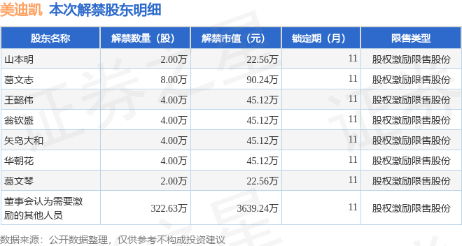 证券之星消息,根据市场公开信息整理,美迪凯(688079)于11月21日将有350.63万股限售股份解禁,为公司股权激励限售股份,占公司总股本0.86%。(本次数据根据历史公告整理得出,实际情况以上市公司最新公告为准)本次解禁后,公司还有716.59万股限售股份,占总股本1.75%。具体如下图所示: