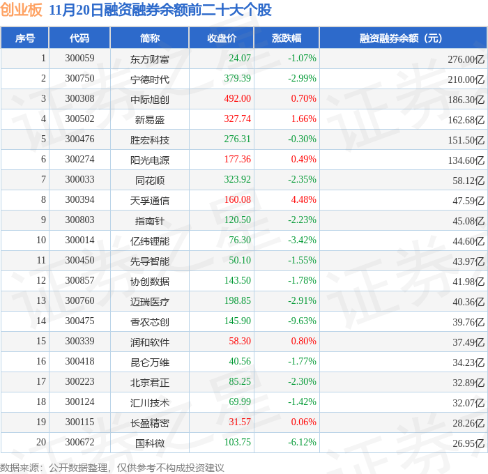 创业板融资融券余额前三分别为:东方财富(300059)融资融券余额276亿元、宁德时代(300750)融资融券余额210亿元、中际旭创(300308)融资融券余额186.3亿元,前20具体见下表: