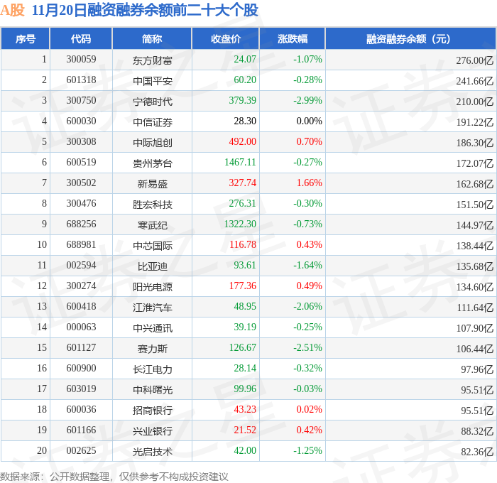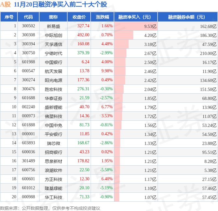 A股融资净买入前三分别为:新易盛(300502)融资净买入9.53亿元、中际旭创(300308)融资净买入4.2亿元、天孚通信(300394)融资净买入3.18亿元,前20具体见下表: