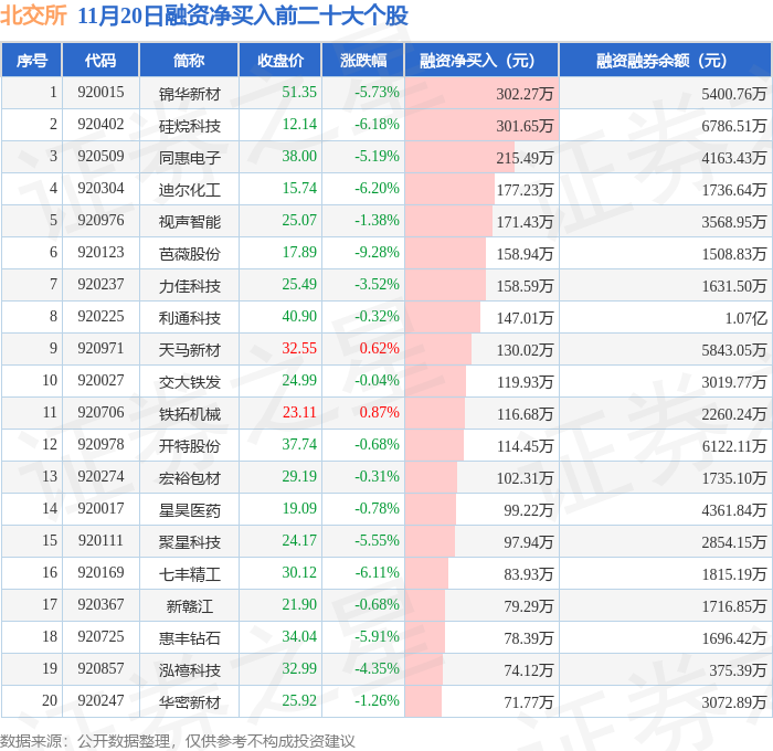 北交所融资净买入前三分别为:锦华新材(920015)融资净买入302.27万元、硅烷科技(920402)融资净买入301.65万元、同惠电子(920509)融资净买入215.49万元,前20具体见下表: