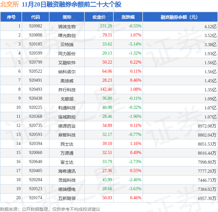 北交所融资融券余额前三分别为:锦波生物(920982)融资融券余额4.12亿元、曙光数创(920808)融资融券余额3.52亿元、贝特瑞(920185)融资融券余额3.38亿元,前20具体见下表: