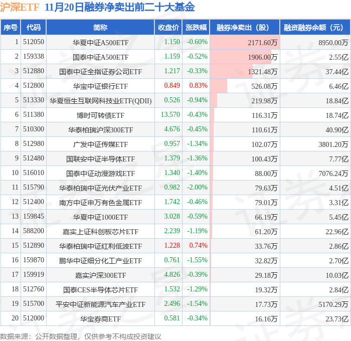 沪深ETF融券净卖出前三分别为:华夏中证A500ETF(512050)融券净卖出2171.6万股、国泰中证A500ETF(159338)融券净卖出1906万股、国泰中证全指证券公司ETF(512880)融券净卖出1321.48万股,前20具体见下表: