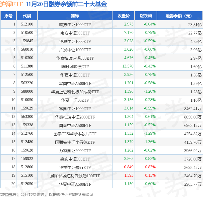 沪深ETF融券余额前三分别为:南方中证1000ETF(512100)融券余额23.81亿元、南方中证500ETF(510500)融券余额22.77亿元、华夏中证1000ETF(159845)融券余额4.73亿元,前20具体见下表: