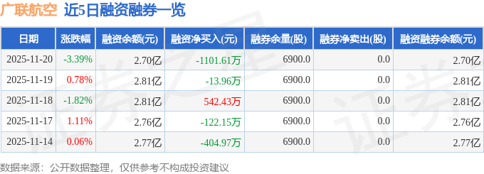 广联航空融资融券信息显示,融资方面,当日融资买入984.16万元,融资偿还2085.77万元,融资净偿还1101.61万元。融券方面,融券卖出0.0股,融券偿还0.0股,融券余量6900.0股,融券余额11.99万元。融资融券余额2.7亿元。