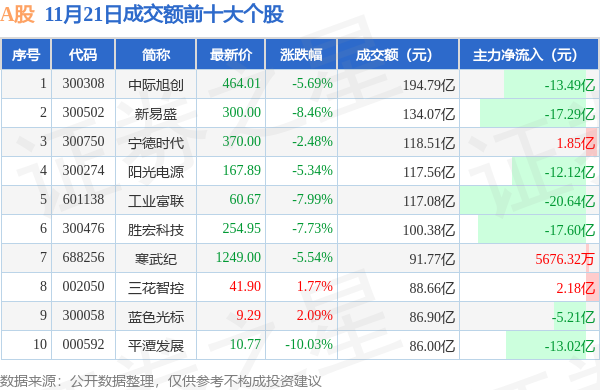 当日A股成交额前10大个股中2只个股收涨,平均涨幅1.93%,其中中际旭创(300308)以成交额194.79亿元排第一。从主力资金流入看,成交额前10大个股中有3只个股呈现主力资金净流入。