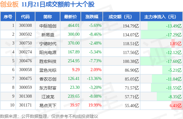 当日创业板成交额前10大个股中2只个股收涨,平均涨幅11.04%,其中中际旭创(300308)以成交额194.79亿元排第一。从主力资金流入看,成交额前10大个股中有2只个股呈现主力资金净流入。