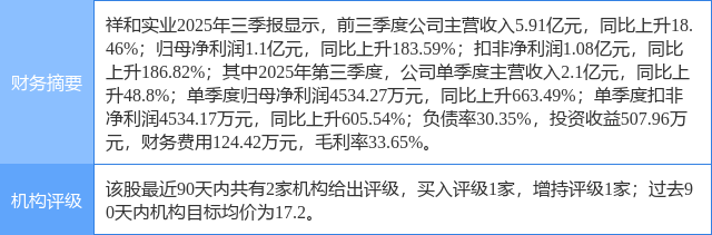 2025年11月4日,西南证券研究员邰桂龙,杨云杰发布了对祥和实业的研报《2025年三季报点评:盈利能力大幅提升,后市场、检测装备放量在即》,该研报对祥和实业给出“买入”评级,认为其目标价为17.2元,研报发布时股价为12.51元,预期涨幅为37.49%。研报中预计公司2025-2027年归母净利润分别为1.4、1.7、1.9亿元,当前股价对应PE为30、25、22倍,未来三年净利润复合增长率37%。铁路投资高景气驱动下,公司扣件业务持续受益,同时铁路智能检测装备技术优势显著,有望打造第二增长曲线,上调至“买入”评级。证券之星数据中心根据近三年发布的研报数据计算,该研报作者对此股的盈利预测准确度为62.29%。