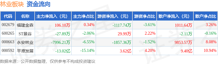 从资金流向上来看,当日林业板块主力资金净流出13.81亿元,游资资金净流入3.32亿元,散户资金净流入10.49亿元。林业板块个股资金流向见下表: