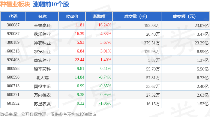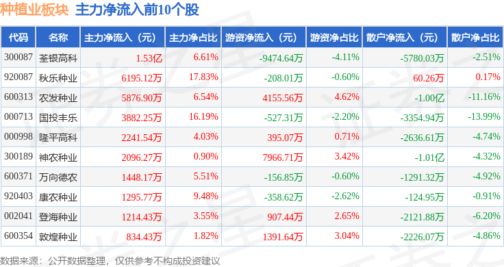 从资金流向上来看,当日种植业板块主力资金净流入1.58亿元,游资资金净流入1.09亿元,散户资金净流出2.67亿元。种植业板块个股资金流向见下表: