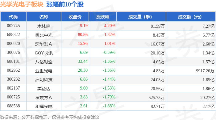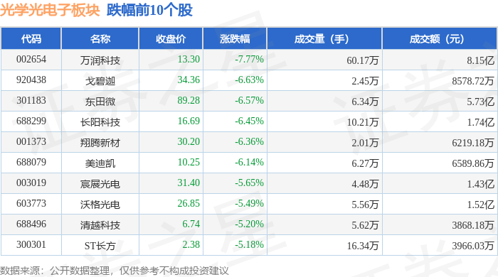 证券之星消息,11月21日光学光电子板块较上一交易日下跌3.12%,万润科技领跌。当日上证指数报收于3834.89,下跌2.45%。深证成指报收于12538.07,下跌3.41%。光学光电子板块个股涨跌见下表: