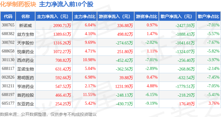 从资金流向上来看,当日化学制药板块主力资金净流出34.89亿元,游资资金净流入5.1亿元,散户资金净流入29.79亿元。化学制药板块个股资金流向见下表:
