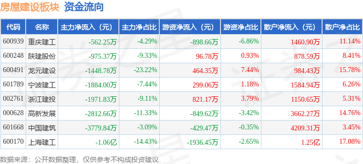 从资金流向上来看,当日房屋建设板块主力资金净流出2.4亿元,游资资金净流出2432.83万元,散户资金净流入2.64亿元。房屋建设板块个股资金流向见下表: