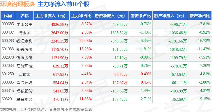 从资金流向上来看,当日环境治理板块主力资金净流出10.85亿元,游资资金净流入2.9亿元,散户资金净流入7.95亿元。环境治理板块个股资金流向见下表:
