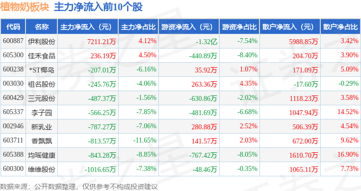 从资金流向上来看,当日植物奶板块主力资金净流出9486.92万元,游资资金净流出1.79亿元,散户资金净流入2.74亿元。植物奶板块个股资金流向见下表: