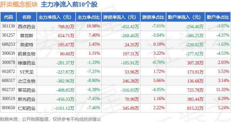 从资金流向上来看,当日肝炎概念板块主力资金净流出7.33亿元,游资资金净流入1.42亿元,散户资金净流入5.91亿元。肝炎概念板块个股资金流向见下表: