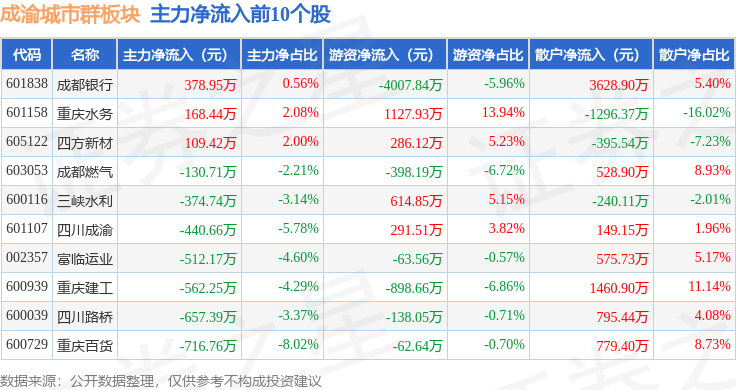 从资金流向上来看,当日成渝城市群板块主力资金净流出3.6亿元,游资资金净流入2648.71万元,散户资金净流入3.34亿元。成渝城市群板块个股资金流向见下表: